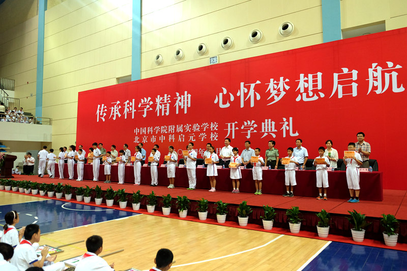开学典礼上,中国科学院附属实验学校、北京市中科启元学校宣告成立并举行揭牌仪式。与会领导和嘉宾依次为学校“好儿童”、“三好学生”、“优秀学生干部”、“优秀毕业生”颁奖,学校领导作了新学年致辞。