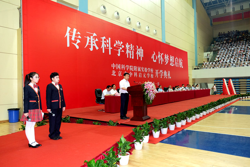 吴建国对地方政府相关部门以及学校全体师生为学校成立和建设付出的巨大努力表示感谢。他指出,中科院附属实验学校的成立是以我院“率先行动”计划和创新“2020”为指引,加快推进后勤支撑体系建设、深入实施京区“3H工程”、切实解决科技工作者后顾之忧的重要举措。不仅完善了我院从启蒙教育、基础教育到本、硕、博高等教育的全过程教育体系,而且开创了我院与地方深化合作与协同发展的新典范,搭建了新的公共教育服务平台,能够把我院的教育传统和优势惠及更多的职工群众。 他强调,中科院将发挥京区单位的科技资源和学科优势,调动院内外各方力量和积极因素,建立有利于学校软硬件条件改善和基础设施建设的资金支持机制、有利于教育载体丰富和教学方法创新的资源共享机制以及有利于教育人才引进和教师队伍发展的人才服务机制,为学校下一步建设发展当好坚实的后盾。希望学校全体教职员工始终秉承中科院的优良传统和作风,牢记责任、把握机遇、攻坚克难、厚积薄发,努力将中科院附属实现学校建成具有示范引领作用的一流学校。 中科院人事局副局长陈光,中科院行政管理局全体班子成员、北京市政府教育督导室副主任关国珍、朝阳区教委副书记刘丽彬、区政府教育督导室副主任尚金森,以及中国农机院、306医院等学校友邻单位主要领导同近1800名学校师生一起参加了开学活动。