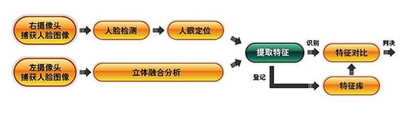 人脸识别设备中左摄像头捕获人脸图像,进行立体融合分析,专用右摄像头捕获到含有人脸的图像后,对人脸进行脸部的一系列相关比对技术,包括人脸检测、人眼定位、人脸特征预处理、记忆存储和比对辨识,达到识别不同人身份的目的。人脸识别系统就是把人脸识别和考勤门禁系统结合,并且通过人脸识别进行考勤门禁管理。